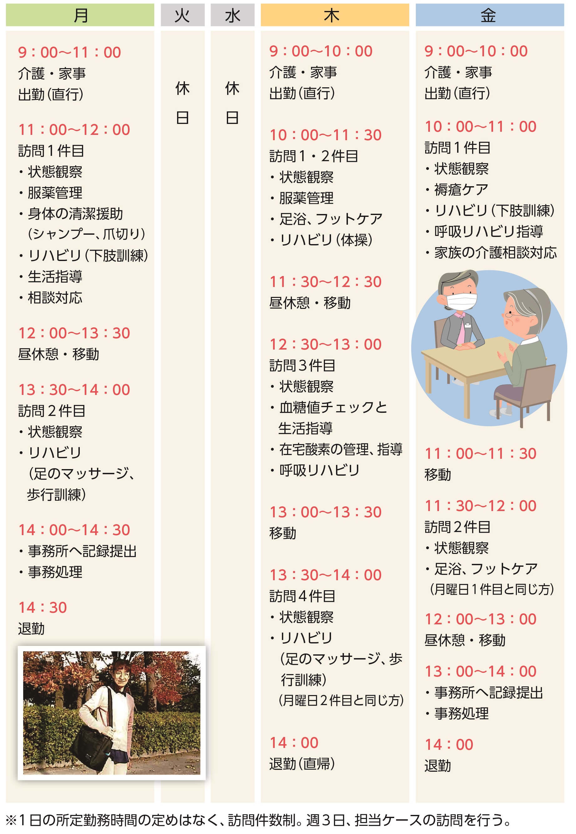訪問看護ステーション・看多機(看護小規模多機能型居宅介護)事業所での仕事について、実際に働いている方の体験談をもとにご紹介します。