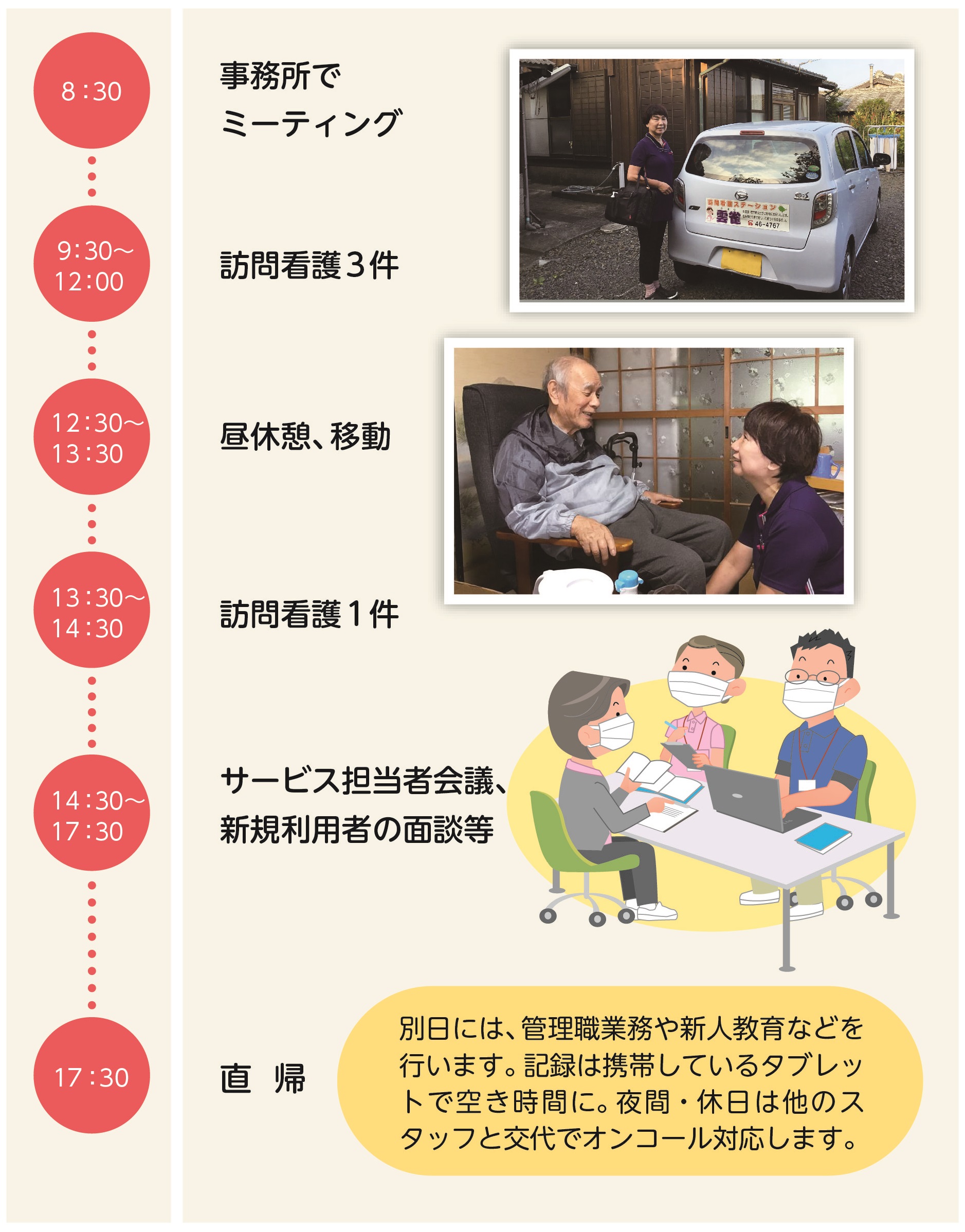 ステーションに看多機が併設されてからは、看護師1名(パート勤務)が看多機に常駐し、私を含めた他の看護師が、月4・5回、当番制で看多機の業務を行っています。当番の日の午前中は看多機で医療処置が必要な利用者の対応を行い、午後は訪問看護に出かけます。利用者に何か異変があれば基本的に常駐看護師が対応しますが、当番担当に連絡があったら駆けつけます。泊まりの利用者がいるので、当番の際は夜間も呼び出しがあれば対応します。