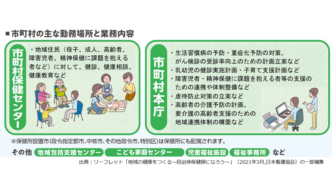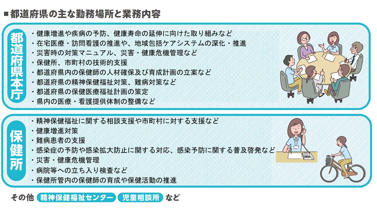 都道府県では、都道府県本庁、保健所、精神保健福祉センター、児童相談所などに配属されます。市町村では、市町村本庁、市町村保健センター、地域包括支援センター、こども家庭センター、福祉事務所などに配属されます。