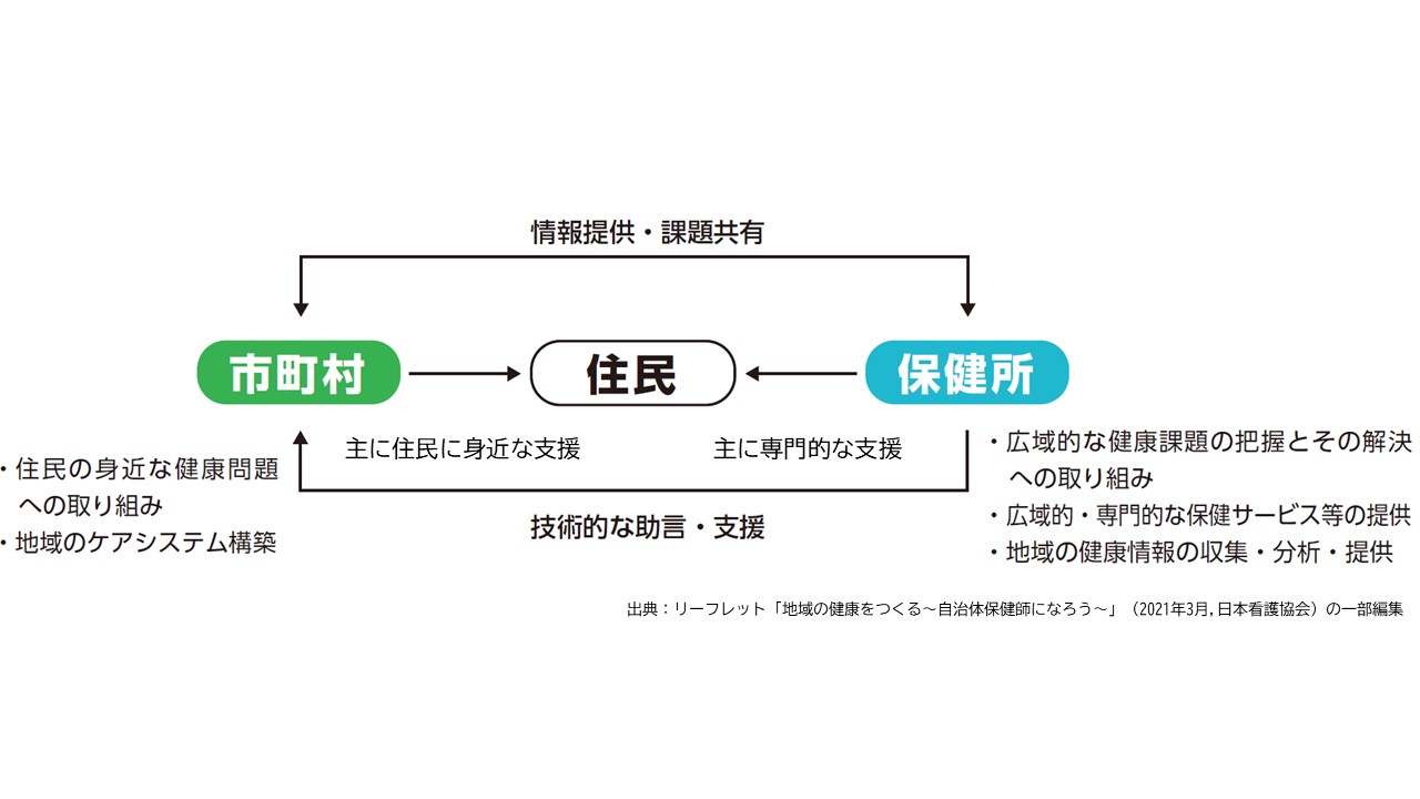 保健師の活動の場は様々ですが、地域全体の健康・療養支援体制と仕組みづくりに向けて、所属組織を超えて、保健師同士で連携・協働したり、多職種とも連携して活動しています。