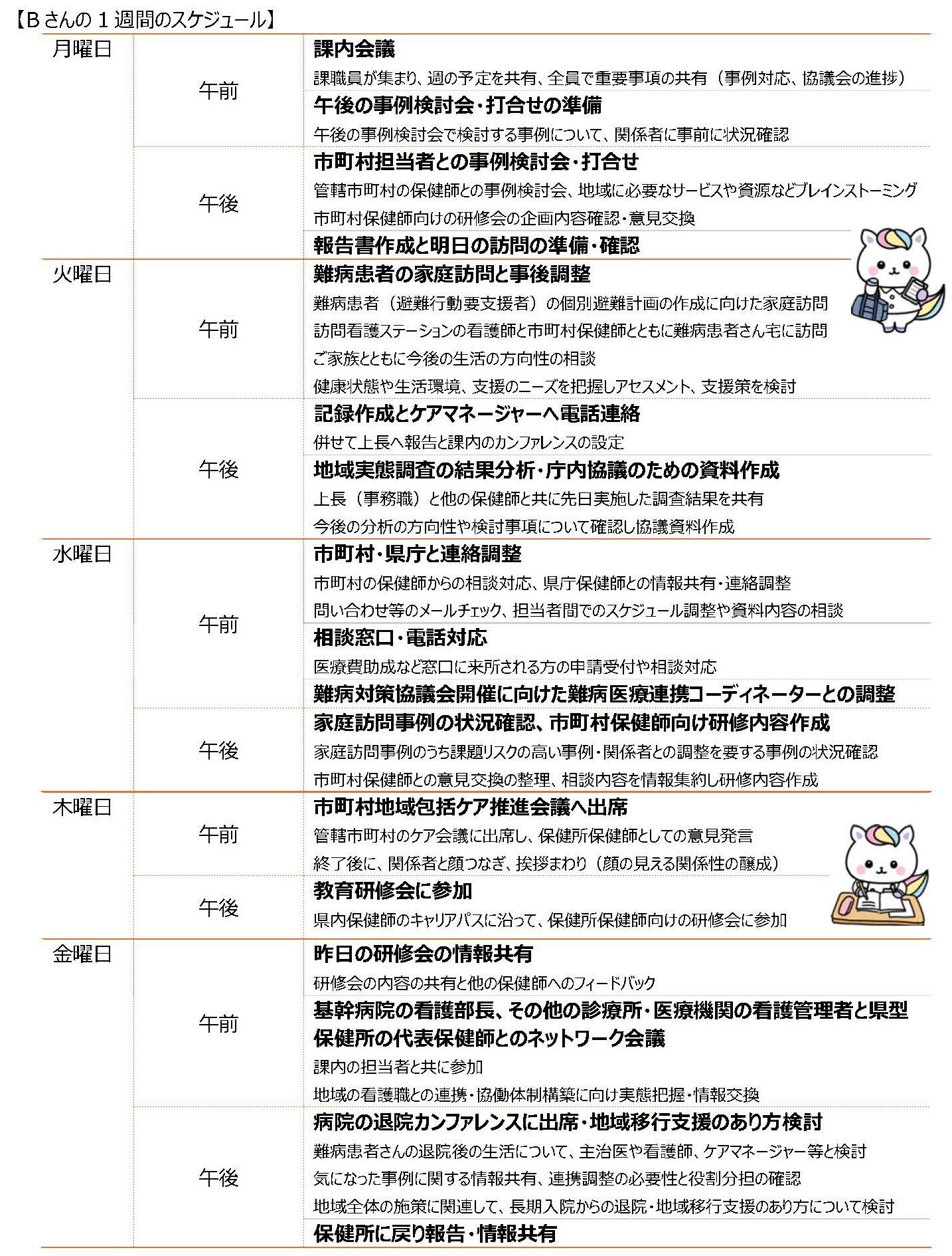 保健所に配属になった当初は、市町村での業務との違いに戸惑うこともありました。保健所保健師は、個別支援にとどまらず、より広域的な視点で地域全体の課題を捉え、施策立案や関係機関への働きかけを行う役割が求められます。こうした点に、保健所保健師ならではの魅力を感じています。また、市町村での経験を活かし、現場の声をもとに広域的・専門的な立場から支援策を検討できることに、大きなやりがいを感じます。現在は、医療機関や福祉サービスと連携した難病患者の生活を支えるネットワークづくりをはじめ、地域全体のケアシステムの構築・仕組みづくりに注力しています。保健師の人材育成の観点でも、保健所管内の市町村保健師と実動を通じた連携をしながら日々活動しています。